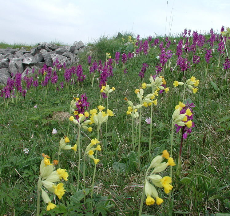 In older habitats like this one in the Derbyshire White Peak (limestone country) P. veris flowers at exactly the same time as Orchis mascula (Early Purple Orchid). Early Purple Orchid is behind the cowslips together with white A. nemorosa in the RHS photo and they cover the hillsides in certain place at the beginning of May. There are few shows of wild flowers en-masse which I know which can compare to the thousands of these delicate yellow, purple and white flowers growing together in Spring. It truly is one of the wonders of the natural world.