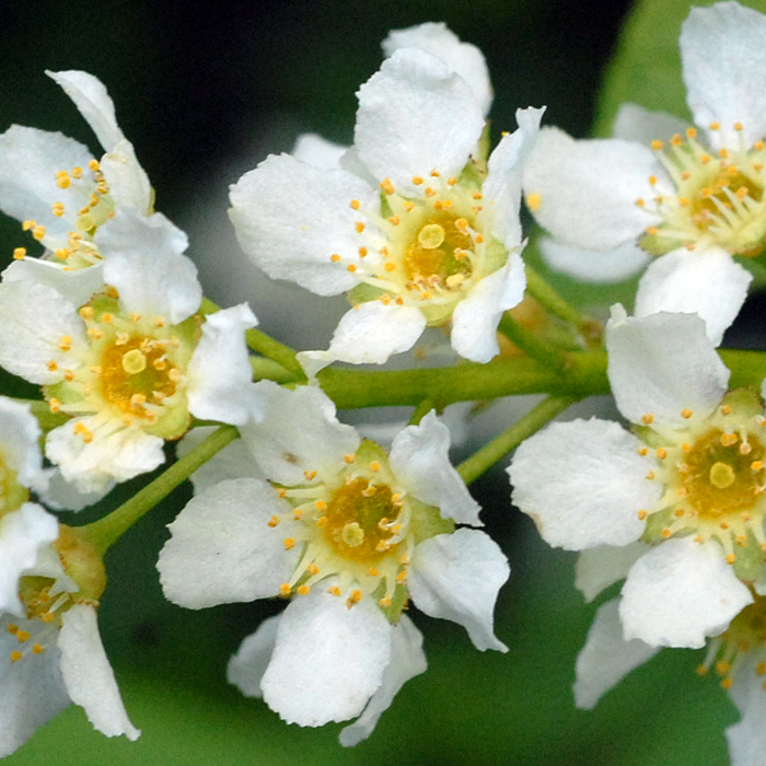 Prunus padus has distinctive long conical racemes which are most obvious just before flowering. It is a native which is very common on basic soils although it will tolerate lower pH soils as well. The fruit looks like a small black cherry.