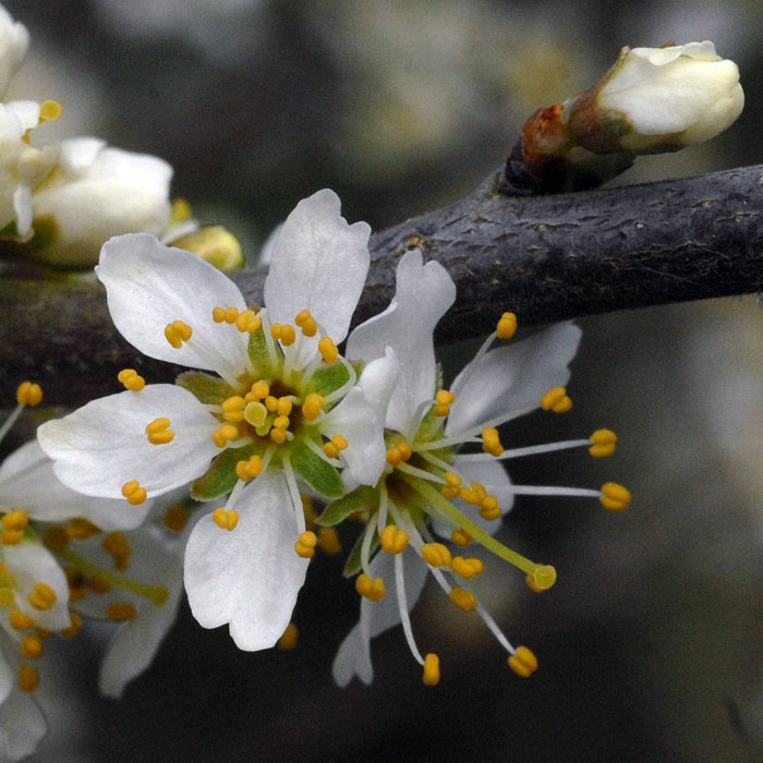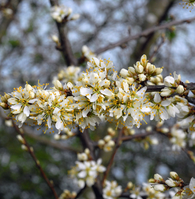 Blackthorn blooms very early, sometimes showing first flowers in January and there are nearly always one or two in February. It flowers before any leaves emerge so has a delightful appearance of bright white blossom on black twigs. The thorns, which can be 2 to 5 cm long, make it tricky to pick the fruits (left) later in the year. They are only about 1 or 2 cm in diameter but looked so delicious in this close-up, I had to use the photo. If the fruits (sloes) are picked late in the year, October or November they can be added, with sugar, to make sloe gin.