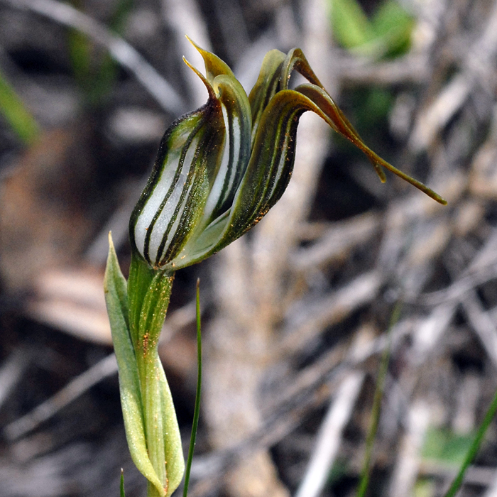 The long pointed parts of the sepals of this orchid point upwards in many of the Pterostylis genus giving them the appearance of having horns like a snail. Hence many are called "Snail Orchids" but generally are known as "Greenhoods". In this plant they are often recurved or pointing downwards from sepals which are usually green and white but which turn brown or reddish when mature.