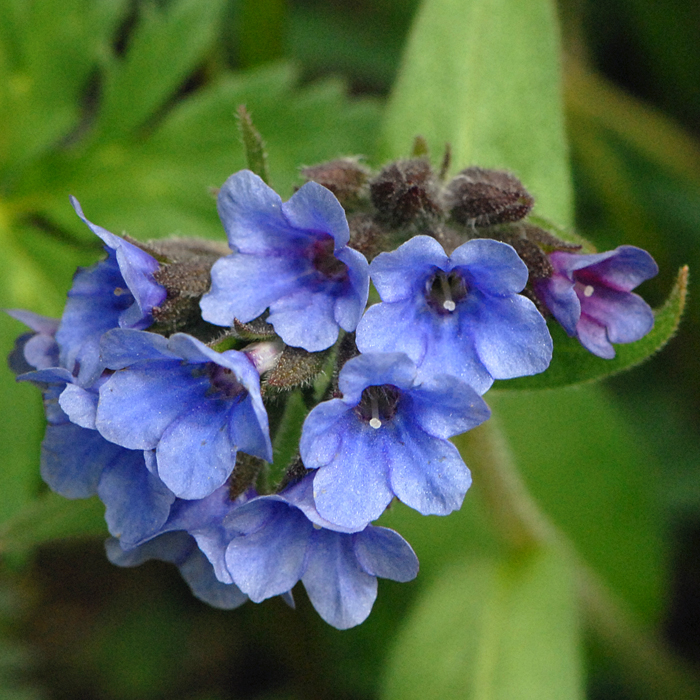 Unlike our British common lungwort (Pulmonaria officinalis) named for the spotty nature of its leaves which in the old days were thought to resemble diseased lungs, this plant has quite narrow leaves with no spots at all. The narrow leaves explain its original systematic name: Pulmonaria angustifolia var australis. where angustifolia means narrow-leaved and australis means southern. P. australis will grow in the hills and mountains at heights of up to 7,000 feet.