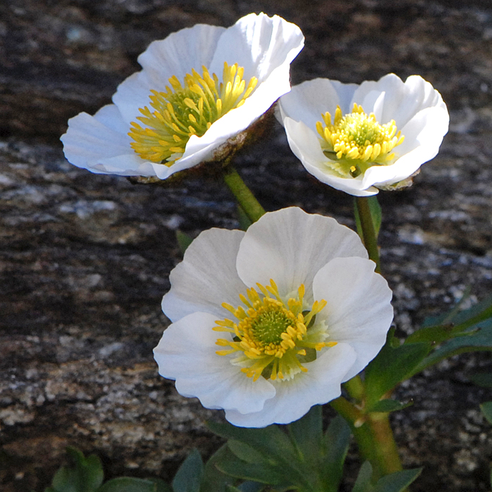 With its thick, almost succulent leaves and large bright white flowers there is no mistaking this beautiful member of the Ranunculus genus. It can be found in the Scandinavian mountains as well as the Pyrenees and the Alps. As its name suggests it will grow amongst rocks and moraines of glaciers and so is found at heights of up to 14,000 feet.
