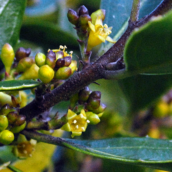 This is an evergreen shrub which has been well naturalised all over the Great Orme for decades to my knowledge. It flowers (no petals) very early, sometimes in late January, and often both leaves and buds are scorched by the frosts and winds of winter here. It is a Mediterranean introduction.