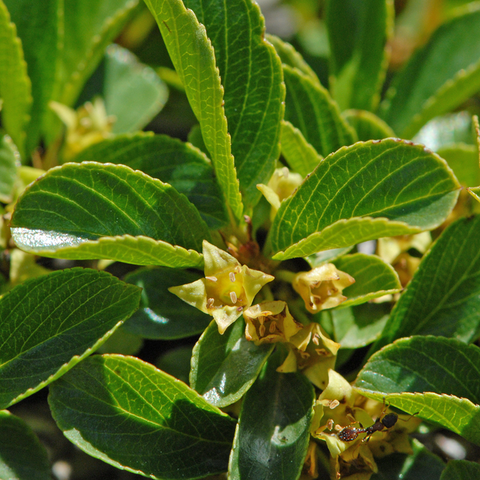 Unlike so many of the other Buckthorns this is a very low growing plant which I rather expected to be named Rhamnus procumbens. The greenish flowers are typical of the Buckthorns and so is the leaf shape but the attractive regularly serrated, glossy leaves are very distinctive when seen in a mat on a rocky surface like this one. It grows at heights of up to 7,000 feet in the Alps, Pyrenees and Apennines.