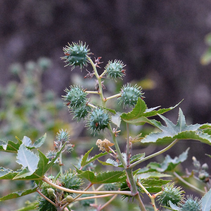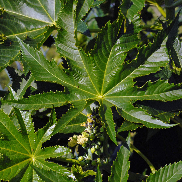 The Castor Oil Plant is a native of both the Mediterranean and eastern Africa and has long been harvested for the oil produced from the fruit. The raw "bean" or seed is usually mottled brownish colour and several are found in each spiny fruit capsule. The very large palmate leaves are sometimes known as Palma Christi and by reputation have healing properties on wounds. The seed itself contains the toxin Ricin which could kill humans and animals if ingested in sufficient quantities. For a plant sometimes referred to as the most poisonous in Europe, there are actually very few reported deaths from poisoning annually.