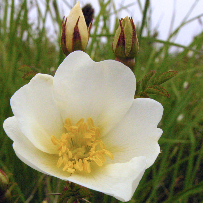 This plant isn't too difficult to separate from the rest of the promiscuous Rosa genus. It is a smallish shrub usually no more than 50cm high and it grows typically in sandy areas near the sea. Flowers can be found on Rosa spinosissima well after summer is over and even in early winter. As the name (spinosissima = very spiny) suggests the stems are covered in dense prickles.
