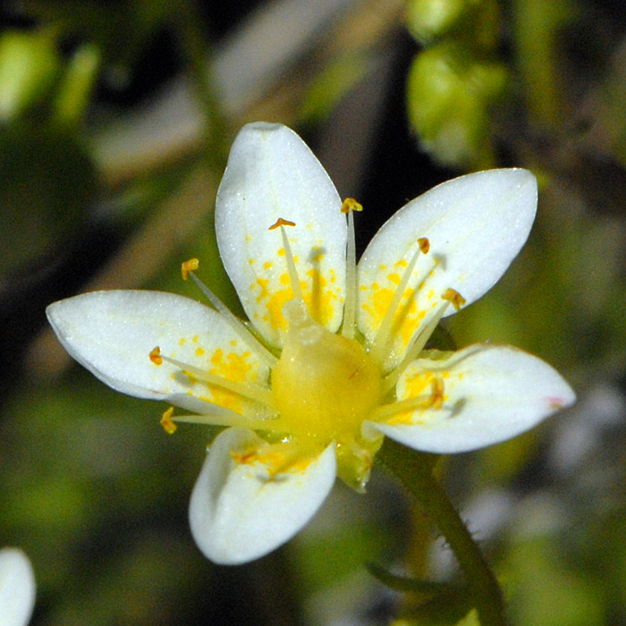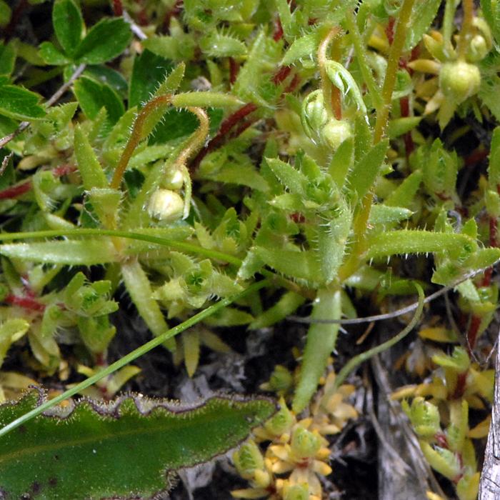 There are many species of Saxifrage to be found in alpine regions such as the Pyrenees and separating them can be quite a problem. Not so much in this case though because the species name aspera (Rough) refers to the leaves, the edges of which are bristly and rough in appearance. The flowers have yellow mottled pattern reminiscent of Saxifraga hirculus (Marsh Saxifrage) or the very common Saxifraga stellaris (Starry Saxifrage). It is found in the Pyrenees and the Alps at heights of up to 10,000 feet.