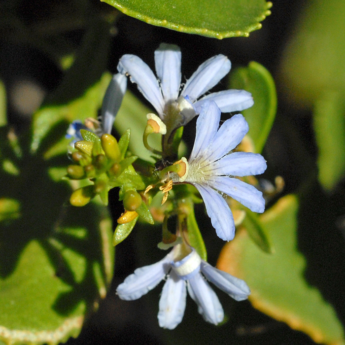 Scaevola crassifolia with its large, almost succulent leaves (crassifolia = thick leaves) is a tree which grows near the coast hardly straying inland at all. It prefers limestone or dune areas which is exactly where this one was found. The coastal distribution ranges from beyond Karratha in the north all along the western coast and beyond Esperance.