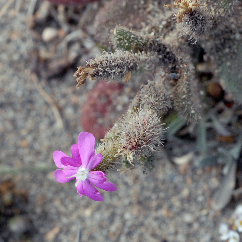 We briefly visited some hides on the salty lagoons of Cabo de Gata which have been used for making salt in Andalucia since Roman times. The big ornithological attraction there is Flamingos and exactly as predicted they were were standing in the lagoon. Of course that also meant there were other salt tolerating plant species to be found and Silene littorea was one. It is normally found growing in sand as this one was and the texts warn that it can be covered in sand grains. This plant was exceptionally glandular hairy and very sandy. The calyces are quite long in this Silene species but hardly discernible under the covering of hairs and sand.