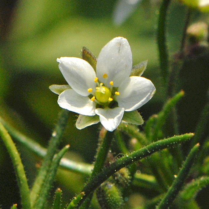 Not many common weeds are described as calcifuges but Corn Spurrey is one. On our acid sandy soil it flourishes in the local allotments and this year there are square metres of white flowers are to be seen in the newly sown cereal fields. Although there are many small white Spring flowers, this one has distinctive thread like leaves and unlike the prostrate Spegula genus, can reach 20 cm in height.
