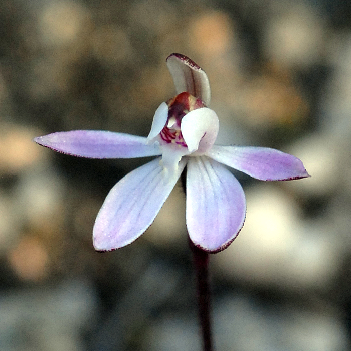 A large genus like Caladenia is often the subject of study and taxonomists are always likely to split off new sub genera. Stegostyla is one such but some reject the split and still think Stegostyla alpina is still part of the Caladenia genus. It does look superficially (to me anyway) like Caladenia hirta ssp rosea (Pink Candy Orchid) from western Australia but this one does have yellowish calli (little lumps) on the labellum rather than red ones.