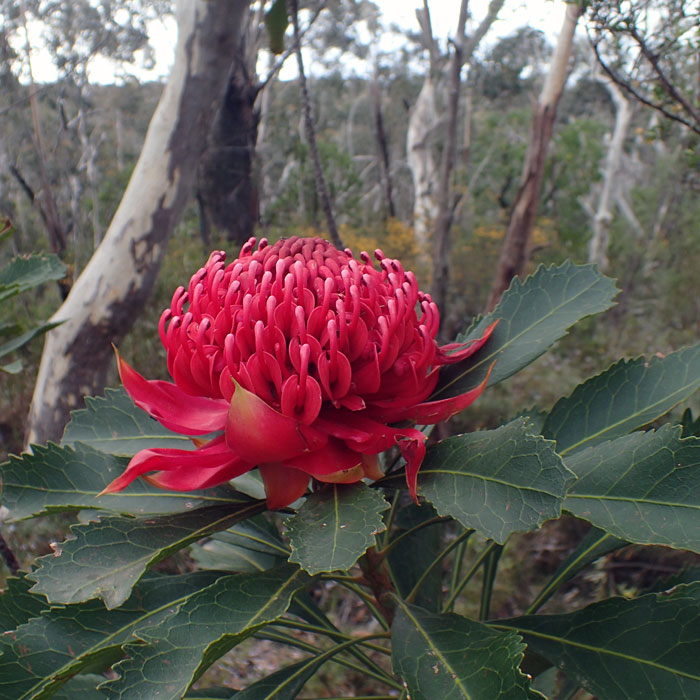 The name Waratah was coined by the Eora Aboriginal people who lived in the area. Although it is said to be reducing in numbers, we found at least 20 in flowering by the side of the forest track on our single day trip from Sydney into the blue mountains.