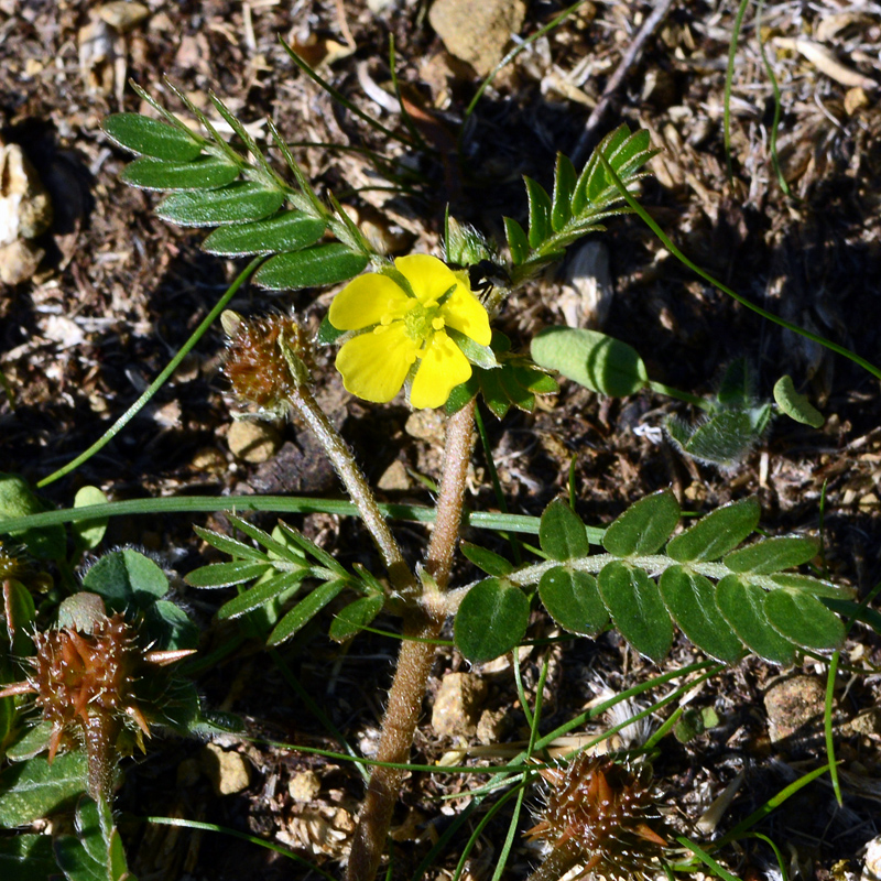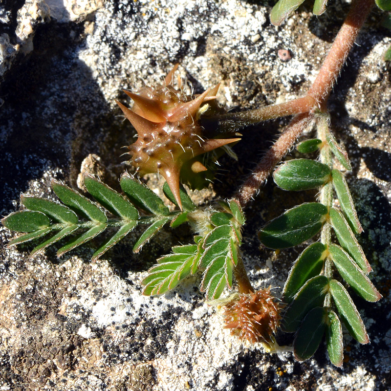 Being a popular herbal remedy in many countries it has acquired many common names such as Goat's-head, Bindii, Bullhead, Burra Gokharu, Bhakhdi, Caltrop, Small Caltrops, Cat's-head, Devil's-eyelashes, Devil's-thorn, Devil's-weed, Puncture vine, Tackweed and Maltese Cross. This fine example of Devil's-weed was actually thriving in the grounds of an ancient monastery but to botanists it is a member of the Caltop (Zygophyllaceae) family. It is native to to this part of Greece and the most distinctive feature, useful for identification, is the thorny looking fruits.
