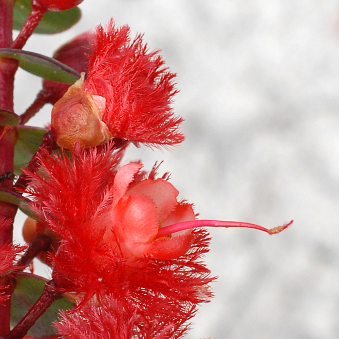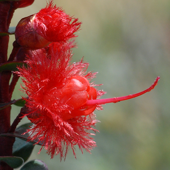 This shrub is every bit as spectacular as it looks. The grey green foliage contrasts with the scarlet florets to generate a real "Wow!" when you see it for the first time. It was only just coming into flower here but even with the first few florets showing it stood out.