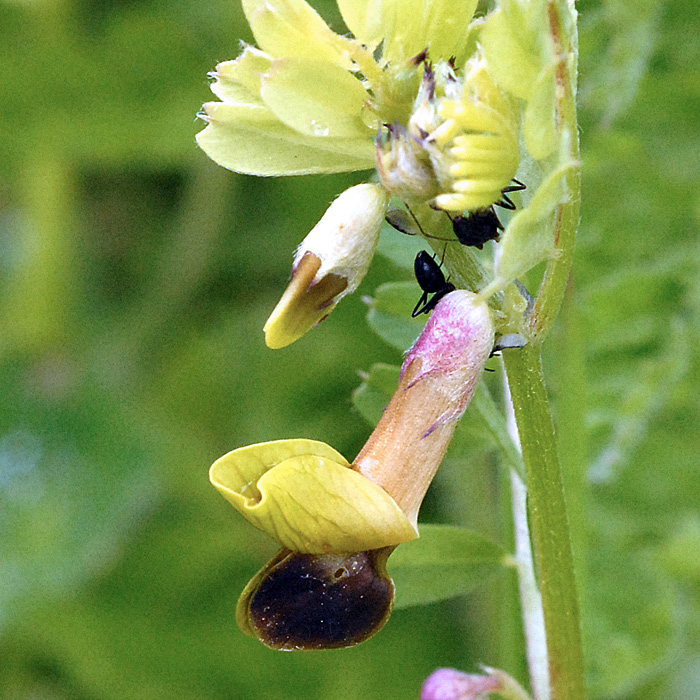 With its unusual black wing petals contrasting with the yellow of the standard or banner petal, this is a small but quite striking vetch. It is found in France, Greece, parts of eastern Europe, the Balkans and Spain. It has even been recorded at least once in England but although included in BSBI's comprehensive 2007 list of plants, it does not rate an inclusion in Flora of the British Isles by Clive Stace.