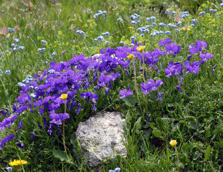 Growing in large numbers on the alpine pastures of the Swiss Alps, this is a stunning alpine flower which you wouldn't hesitate to have, with no nurserymen's cultivation messing, in your own garden. It has bluntish sepals which distinguish it from the equally long spurred Viola cornuta (Horned Pansy), also an alpine plant, which has very long, narrow, sharply-pointed sepals.