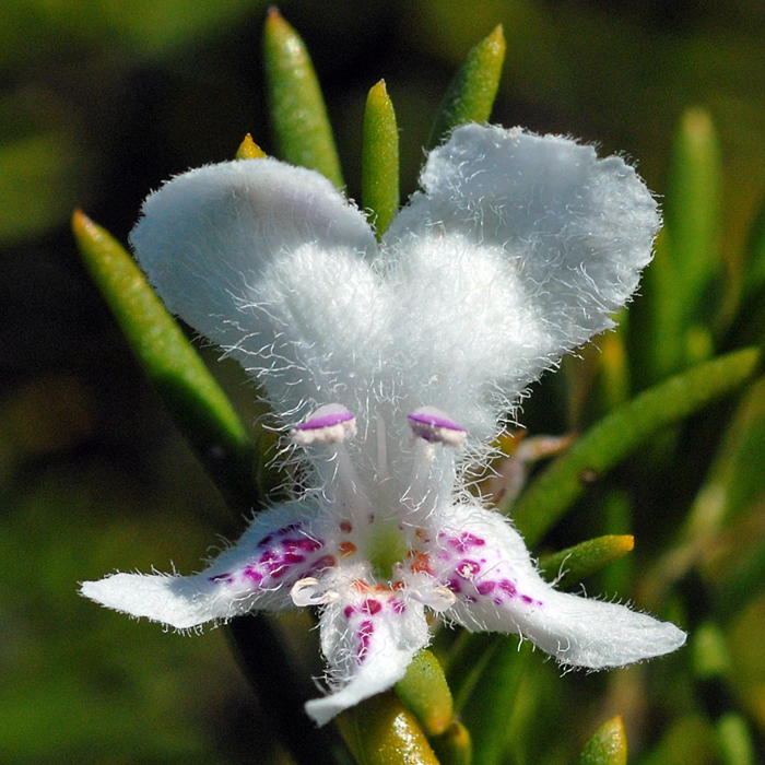 Westringia dampieri is a coastal plant often found in hummocks on the shore itself in both Western and South Australia. At this time of year it was only just coming into flower but the unusual flower makes an excellent close-up even with just a single bloom.