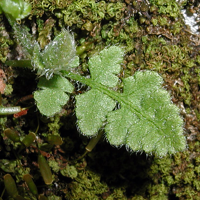 This is one of the very few plants of Woodsia ilvensis known in North Wales and is on a single rock above Cwm Idwal at 2,400 feet. It is very difficult to find being only about 1 or 2 cm in length, even if you know where it is. The puzzle when seeing tiny rarities like this is to know how it was discovered in the first place. The fronds here are newly sprouted so it may be a little bigger towards the end of summer. Although it looks exactly like other photos of British plants it looks very unlike healthier and bigger specimens which grow on continental Europe and it is these healthier bigger plants which the authors have used to illustrate their books on fern identification. The underside of this tiny frond is covered in very long hairs. Like many of our national rarities it is astoundingly unimpressive.