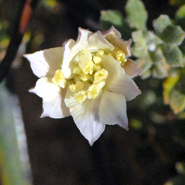 On the lookout for Macropidia fuliginosa (Black Kangaroo Paw) which can be found in this area and north up to Geraldton and south to near Perth, we spied one at the side of the road. Delighted with this find of an uncommon plant, it was a while before we noticed another species growing in the shade of the Black Kangaroo Paw. It was this Xanthosia tomentosa and although not quite fully out, turns out to be even rarer than the Black Kangaroo Paw being confined to the Lesueur sandplains. When fully in bloom the flowers would have the typical Southern Cross shape.
