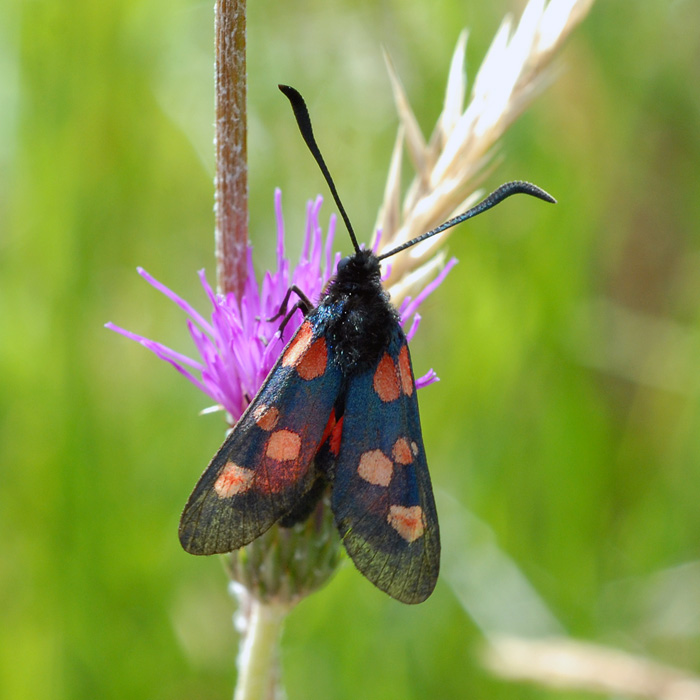 In a field as full of Marbled White (Melanargia galathea) as I've ever seen this little moth settled on a Serratula tinctoria (Saw-wort) flower. We were lucky, the south west is one of its haunts and it flies in July and August.