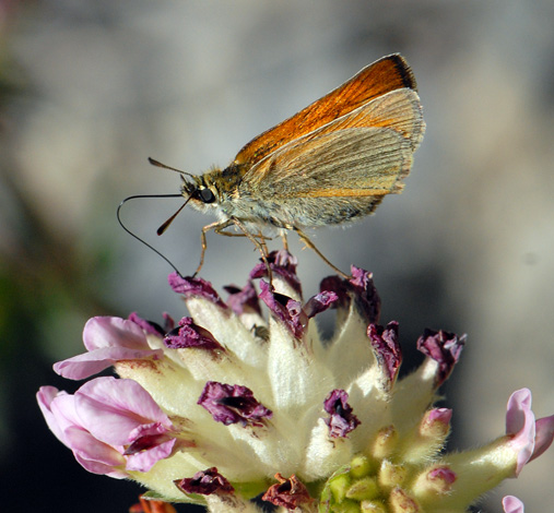 To me this was just another Skipper photo until a friend pointed out that the black tips to the antennae make it an Essex Skipper. The interesting thing about this particular insect is that it appears to be feeding from what we would regard as a dead floret. So assuming that they know better than we do about where nectar is to be found, the flowers of this Anthyllis species retain nectar after the petals have withered.