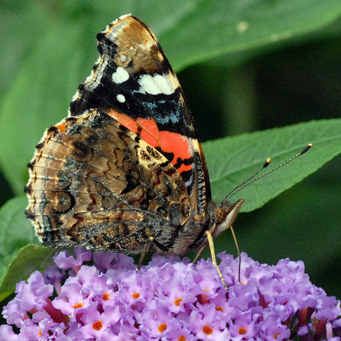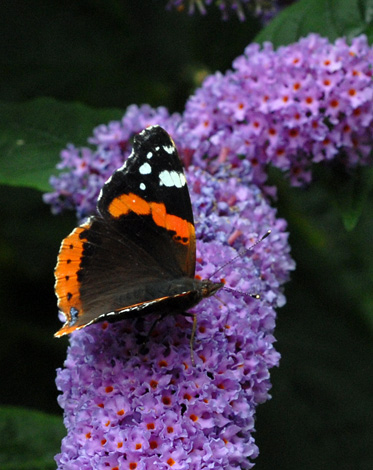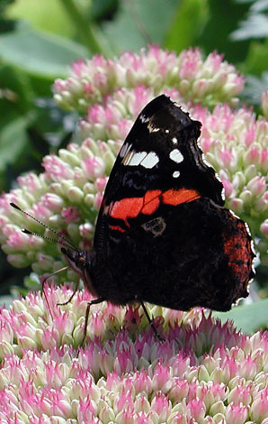 This is an occasional visitor to our garden until the Sedum spectabile or Buddleja davidii flower. Once the first few florets open Red Admirals start to arrive in numbers. The record is 21 at one count on a warm 14th September day in 2003 all on Sedum spectabile.