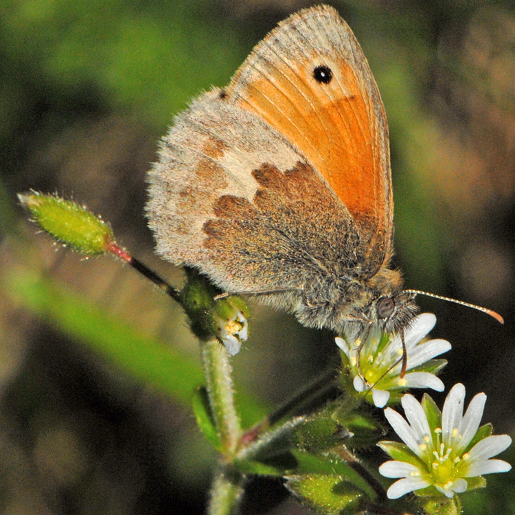 The Small Heath prefers well drained habitat so coastal dunes with flowers are perfect and as well as perching in grasses, it takes nectar from flowers occasionally too. The expanded photo shows one nectaring on Cerastium fontanum (Common Mouse-ear).